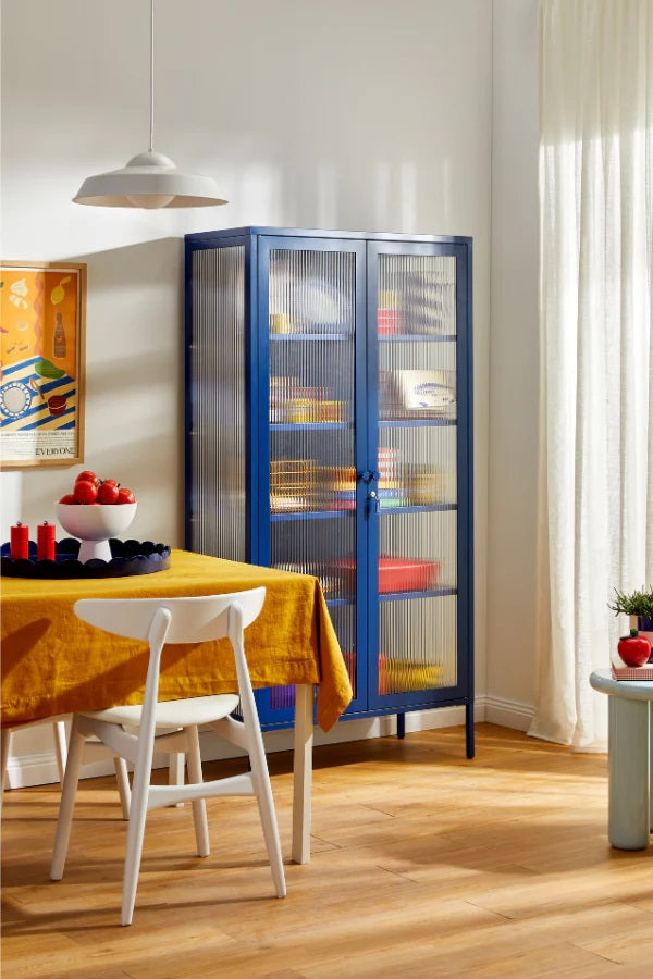Lempinimellä "The Collector" kulkeva korkea lasiovinen peltikaappi vetää sisäänsä kokonaisen astiaston ja toimii upeana katseidenvangitsijana vaikkapa ruokailutilassa, olohuoneessa tai eteisessä. Kaunis ja käytännöllinen lasivitriini tarjoaa mukavasti säilytystilaa ja tuo väriä ja eloa sisustukseen. Vintage-vaikutteisten uurrettujen lasipaneelien ansiosta Collector-lasikaappi hämärtää piilottamisen ja esillepanon rajoja, pitäen huolta arvokkaista muistoesineistäsi, koriste-esineistä tai astioistasi.