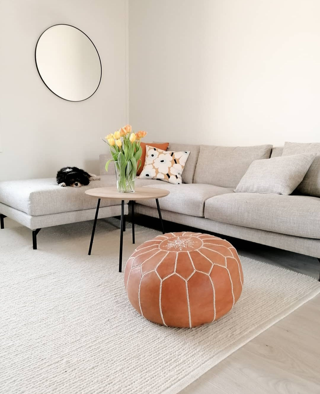 Poufien pintaa koristaa perinteinen Marokon tähtenä tunnettu käsinommeltu symboli. Näiden rahien historia ulottuu aina 1200 luvulle Osmanien valtakunnan ajalle, jolloin käsintehdyt nahkarahit löysivät tiensä ylhäistön koteihin. Ajattoman muotokielensä ansiosta poufit ovat säilyttäneet suosionsa arkipäiväisenä käyttöesineenä. Modernin skandinaavisen sisustamisen trendin keskellä värikkäät poufit tuovat piristystä olohuoneen keskelle.